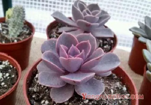 紫珍珠Echeveria Perle von Nurnberg,景天科拟石莲花属,紫珍珠为多年生肉质草本植物,中小型种类。植株肉质叶排成严密的莲座状。紫灰色的叶片向内凸起有分明的曲折,强光下或许温差大,叶片会呈现美丽的粉红至紫红。弱光则叶色浅灰绿,叶片拉长,色彩也变的灰白。叶面润滑,不轻易积水。叶片有细微的白粉,紫珍珠需求承受足够日照叶色叶缘才会美丽,株型才会更紧实雅观,多年群生后,植株会十分壮观,特殊是多年修剪过的老桩。紫珍珠簇状花序花样红粉色,和大多数的石莲花一样的花型。