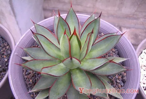 泷雷Agave 'burnt burgundy' 龙舌兰科龙舌兰属肉质草本,无茎,肉质叶呈莲座状陈列,株幅可达30厘米;叶长三角锥形,长10~15厘米,宽约5厘米,尖端细,叶片不太肥厚,反面圆形凹陷,也内凹;叶绿色有微白粉,叶面有新叶发展后留下的淡淡陈迹,叶缘有美丽的紫红色角质边微带锯齿状,叶顶端有0.5~1厘米左右的坚固的红褐色刺,这个刺扎到手上很疼,有点胀鼓鼓的觉得,换盆和取侧芽的时分要留意别被扎到了,泷雷植株的根系十分的兴旺,盆栽的时分发起用大的深点的盆,否则根系会钻出盆底的透水孔的。植株发展20年左右才干着花,松懈的穗状花序高达4米,小花淡绿色,长约5厘米;花后结籽。