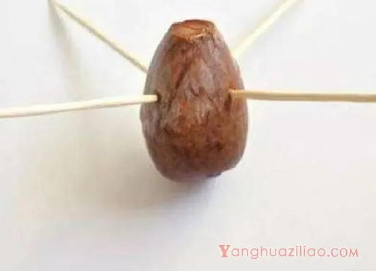 步骤2、准备杯口小一点的杯子,装上清水,将插有竹签的果核架在杯口上,果核大头的一端浸泡在水面下,约占果核高度的1/3左右,果核小头的一端露在杯口之外。