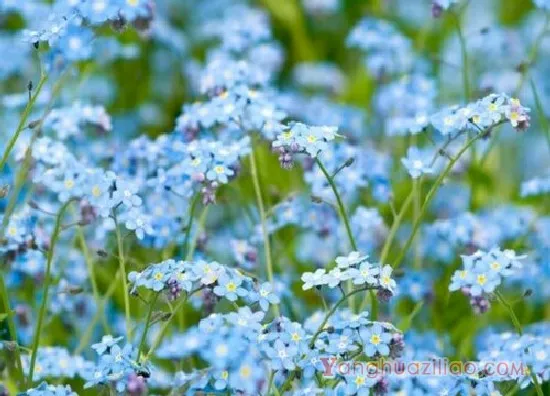 勿忘我的花语是不要忘记我,也代表着希望陪伴在我身边,它的开花时间是4月份,花期是一个月,颜色一般是紫色的,可以送给朋友。