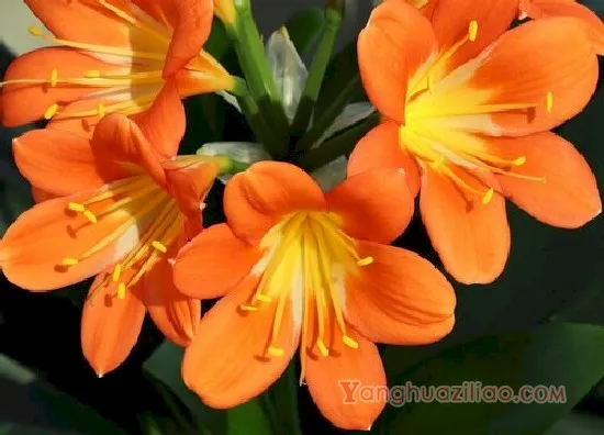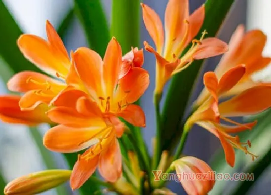 君子兰的品种很多,比较常见的是大花君子兰,其花葶从叶腋中生长出来,等它长出15片叶子的时候就会开花。其开的花有数朵乃至数十朵,在花顶呈伞状聚生,花色有深红、橘红、橙黄、淡黄等等。