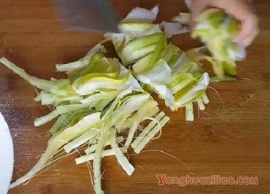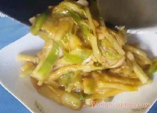 第一步:将火龙果花切成小块,香菇切片、大蒜切片,炒锅热油,爆香蒜头,将肉丝放入炒至变色,放入香菇,拌炒一下,加入火龙果花。