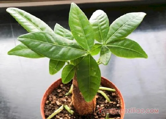 发财树又叫光瓜栗,它的株高在5米以上,茎杆粗壮光滑,树皮颜色为褐色或者浅棕色,但发财树很少开花,常作为观叶植物摆放在室内。